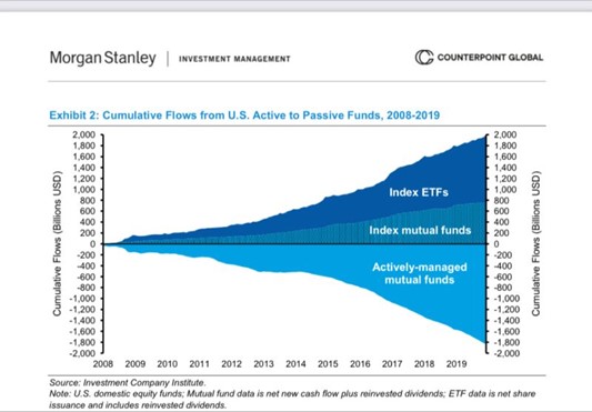 Este gráfico es muy conocido y los defensores de la gestión indexada (que no pasiva) lo usamos para mostrar el gran crecimiento de fondos indexados y ETFs que replican índices, es decir, que compran todas las compañías que componen un índice.