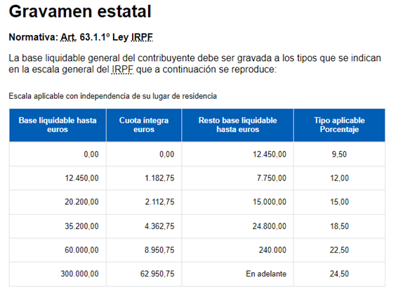 Ve al Manual práctico de la renta 2023, capítulo 15 (Cálculo del impuesto. Determinación de las cuotas íntegras). Dentro del epígrafe titulado «Gravamen base liquidable general» busca en la tabla el rango en el que se encuentra tu base liquidable y su tipo marginal aplicable. Por ejemplo, si tu base es 35.300 €, el último euro te lo gravan al 18,5 %.
