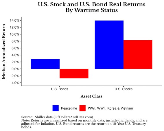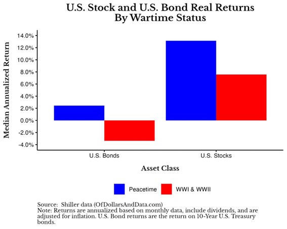 En particular, tanto las acciones como los bonos estadounidenses tuvieron un rendimiento real anualizado medio que fue aproximadamente un 5 % menor durante tiempos de guerra que durante tiempos de paz.