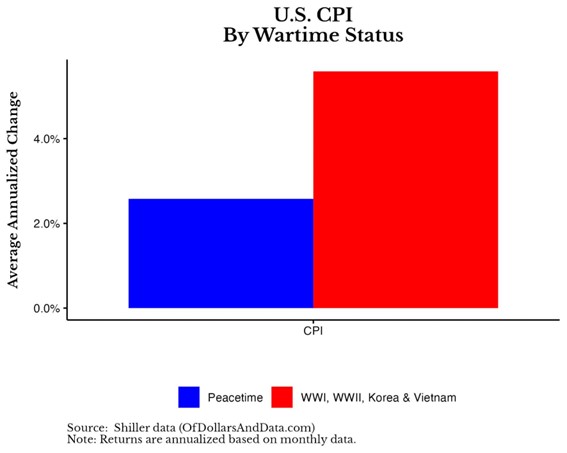 Como puede ver en el gráfico a continuación, la inflación (IPC) tiende a ser aproximadamente un 3 % más alta (en promedio) durante tiempos de guerra que durante tiempos de paz.