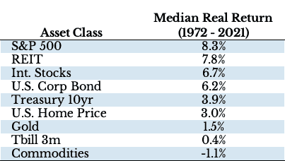 A continuación, para ubicarnos, vamos a mostrar los rendimientos de largo plazo de las principales clases de activos. En esta tabla se puede ver que las acciones estadounidenses, el sector REIT y las acciones internacionales han sido las clases de activos que mayor rendimiento han dado: