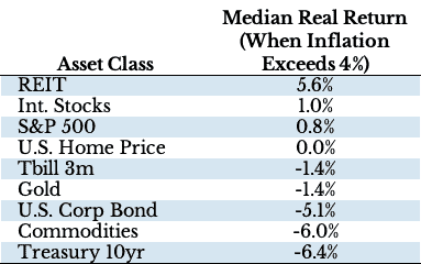 Ahora bien, si observamos los rendimientos de estas clases de activos cuando la inflación supera el 4 %, vemos como los números son un desastre: