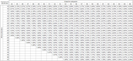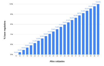 La base reguladora hay que multiplicarla, tal y como indica el LGSS 210vii, por un porcentaje en función del número total de años cotizados que empieza en el 50 % con 15 años y crece de forma casi lineal hasta llegar al 100 % con 37 años.