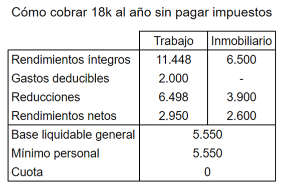 Esta cifra requiere un pequeño ajuste. El mínimo personal por contribuyente es con carácter general de 5.550 €. A eso se le podría añadir los mínimos en caso de descendientes, ascendientes, discapacidad, etc. Pero, además, algunas comunidades autónomas han incrementado estos mínimos. Teniendo solo en cuenta el mínimo por contribuyente, esto quiere decir que, por ejemplo, si vives en Mallorca podrías llegar a cobrar hasta 18.503 € sin pagar impuestos.