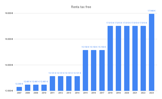 Una. El máximo, hoy, es 17.948 € pero ¿cómo ha evolucionado esta cifra a través de las últimas reformas del IRPF? Pues, en los últimos 10 años la renta máxima ha subido un 37 % y en los últimos 15 un 46 %. También es verdad que no es lo mismo un euro de 2007 que uno de 2023, pero la tendencia es buena y ha batido a la inflación.