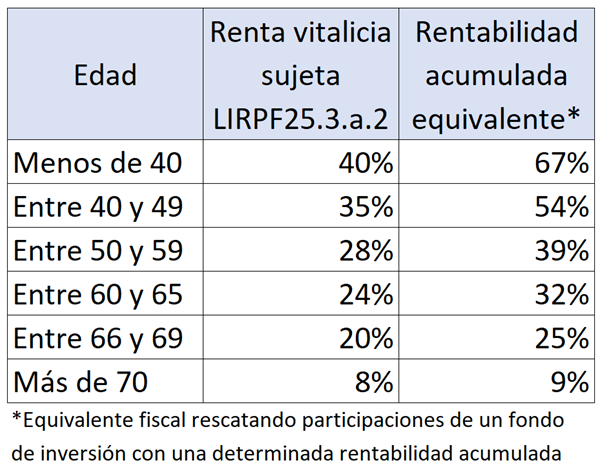 Por ejemplo, si constituyes la renta vitalicia entre los 40 y 49 años solo será rendimiento del capital mobiliario el 35 % de lo que vayas cobrando. Esto sería el equivalente fiscal a rescatar participaciones de un fondo de inversión con una rentabilidad acumulada del 54 %: