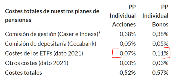 Aquí hay dos capas de costes: los costes relacionados con el «vehículo padre», el plan de pensiones (PP) que gestiona Indexa, y los costes relacionados con los vehículos subyacentes, los ETF en los que invierte el PP.