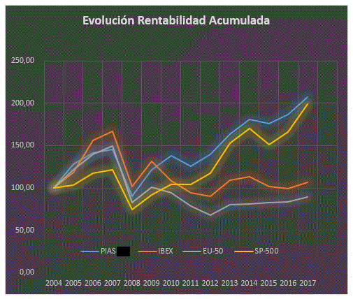 - Gráficas de su producto comparado con los índices. Índices sin dividendos y PIAS sin comisiones (ejemplo real, visto en Balio).