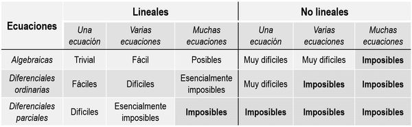 Dichas variables, al depender parcial y dinámicamente unas de la evolución de otras, estarán por tanto acopladas y evolucionarán en el tiempo de manera no-lineal. Aquí está la clave: esto implica necesariamente que la solución de sus ecuaciones será en el mejor de los casos de dinámica caótica (lo que significa que la mayoría, sino todo el tiempo, su evolución será impredecible) o directamente imposibles de resolver (Fig.2).