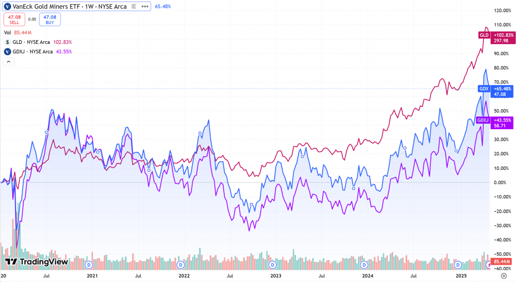 - GDXJ (VanEck Junior Gold Miners ETF): Mismo «asset manager», pero enfocados en empresas más pequeñas de exploración y desarrollo.