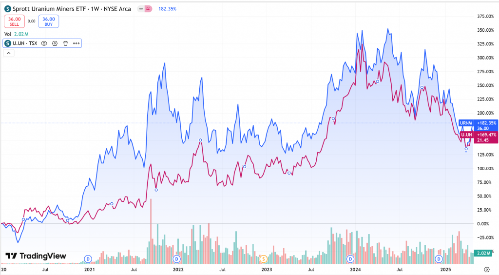 Por supuesto, depende mucho de qué horizonte temporal analicemos y de cada metal, pero en líneas generales se observa casi siempre que los ETFs lo suelen hacer igual o mejor por breves periodos de tiempo en mercados alcistas, bastante peor en mercados bajistas, e igual o peor a largo plazo. Por ejemplo, en el caso del GDX se ve cómo lo hizo ligeramente mejor que el oro tras el COVID en 2020, pero bastante peor en 2022 (un año durísimo para las mineras de oro). En los últimos 12 meses, que han visto de las mayores subidas del oro en 60 años con un +40%, el GDX apenas lo iguala con +37%. En el caso de las mineras de plata, la gráfica habla por sí sola. No obstante, hay algún caso como el uranio, donde las mineras tampoco lo hicieron tan mal e hicieron outperformance durante un tiempo.