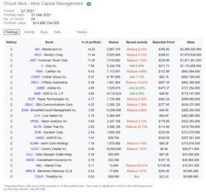 Dataroma nos ofrece este servicio de forma 100% gratuita. Como ejemplo, aquí está la cartera de Chuck Akre, director de inversiones de Akre Capital Management y uno de mis inversores favoritos.