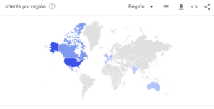 Google Trends no sólo permite analizar la evolución del interés del mercado en los productos y servicios de una empresa a lo largo del tiempo. También nos ayuda a entender el interés de un producto a lo largo del mundo. Por ejemplo, en este gráfico podemos ver cómo a la empresa de fitness Peloton, a pesar de haber crecido mucho en EE.UU., todavía le quedan muchos países por los que seguir expandiéndose a nivel mundial.