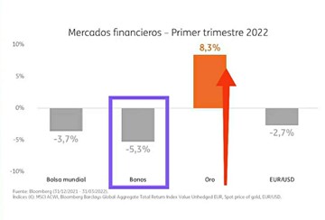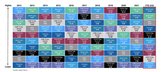 De hecho, no hay ningún activo de renta fija que esté en positivo este ejercicio. Si te fijas en el cuadro de más abajo, en la última de las columnas, ya sean bonos globales, americanos, high yield… TODOS EN NEGATIVO, y a ti tu banco te dijo que la renta fija era segura…