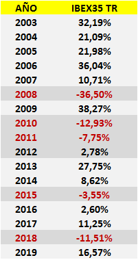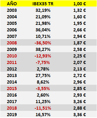 Entre los 17 años que median entre 2003 y 2019 el IBEX35 TR, que incluye la reinversión de los dividendos, ofreció una rentabilidad compuesta anual de un notable 7,39%: