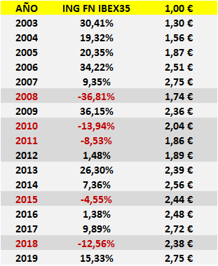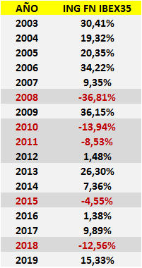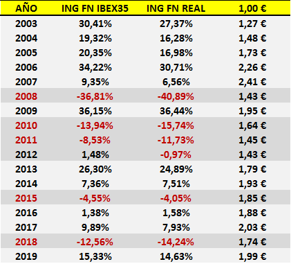 Por otro lado, uno de los fondos índices referenciados al benchmark español y más veteranos de nuestro mercado, el ING Fondo Naranja IBEX35 (FN), habría obtenido una rentabilidad compuesta anual del 6,12%: