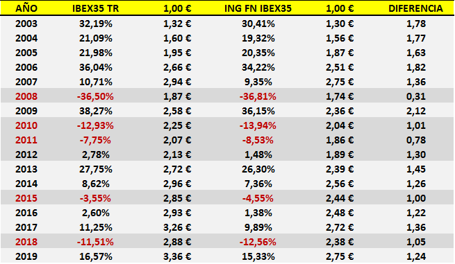 Por supuesto, la explicación acerca de la alta discrepancia entre la performance, ya de por sí mediocre, del IBEX35 TR y la del FN radica en el coste del producto, en teoría un 1,1% sobre patrimonio, aunque en la práctica un poco más: