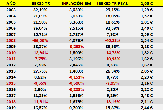 En términos reales el IBEX35 TR ha generado una rentabilidad compuesta anual del 5,40%, alejada del anterior 7,39%, y acumulado total del 144%, también lejos del 236% previo. De hecho, un euro invertido en 2003 equivaldría, en el mejor de los casos, a 2,44€ y ni por asomo se podría afirmar que el inversor «está mejor que nunca» porque en realidad estaría más o menos igual que al terminar el año 2006. Es decir, igual o casi igual que hace 13 años: