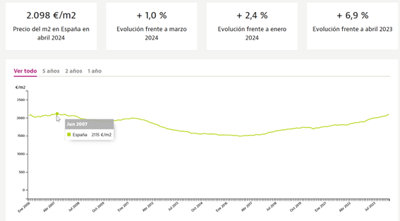 Los precios máximos alcanzados en junio de 2007 en España fueron de 2.115 euros por metro cuadrado, y con el último dato de abril de 2024 están en 2.098; así que, tras casi 17 años, todavía no se han recuperado los precios medios de la vivienda en España.