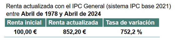 ¿Y cuánto han subido los precios en este mismo periodo? Según el Instituto Nacional de Estadística (INE)[4], los precios han subido desde abril de 1978 a abril de 2024 un 752 % (100 € de 1978 equivalen a 852 € de hoy, es decir, se han multiplicado por 8,52), que equivalen a un 4,8 % medio anualizado.