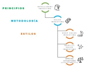 Considerando esto, podemos concluir que el value investing es la materialización metodológica en el ámbito de la inversión del intelligent investing. Es decir que, en cualquier caso, el primer concepto debería estar englobado en este segundo, más abstracto y amplio. Tengo mis reservas a la hora de determinar si hay cabida para más metodologías que puedan acompañar al value investing en ese segundo escalón, puesto que es difícil aunar las ideas y premisas del intelligent investing de manera más pura. Pero, eso sí, debajo del value investing encontramos distintos estilos. Si el value investing gira alrededor del concepto del margen de seguridad, la variedad de estilos que funcionan es muestra de que existen distintos enfoques para calcularlo, dependiendo de las características de cada empresa. Pese a ello, no debemos olvidar que estos estilos NO son excluyentes entre sí y que todos permiten encontrar ineficiencias que justifiquen una decisión de inversión como inteligente. Sí, lo sé… Es un lío. El siguiente esquema debe servir para que podamos ubicar cada uno de estos conceptos en el nivel que les corresponde: