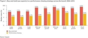 1.       En primer lugar, no es posible predecir hoy cuáles serán los fondos concretos que batan a los índices durante los próximos años. El hecho de que un fondo lo haya conseguido en los últimos años no es razón suficiente para que siga haciéndolo. De hecho, suele ser indicador de justo lo contrario. Un ejemplo: sólo un 5% de los fondos USA de bolsa en primer cuartil en 2013 repitieron cuartil en 2014. Y a 5 años, ninguno de los fondos que invierten en acciones de gran o mediana capitalización logra mantenerse en el primer cuartil. A pesar de que la prensa y los medios especializados dedican toda su atención y elogios a los fondos que batieron su índice el año pasado, invertir “persiguiendo los mejores fondos” es la peor manera de elegir un fondo de inversión (y sin embargo, sigue siendo el factor determinante con el que la mayoría de los inversores toman sus decisiones de inversión):