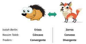 La primera opción implica una cosmovisión del mundo que Isaiah Berlin calificó como «mentalidad del zorro», Nassim Taleb como «estrategias convexas» y los antiguos traders del pit de Chicago llamaban «estrategias divergentes». A los segundos, Berlin los bautizó como «erizos», Taleb «cóncavos» y los traders «convergentes».