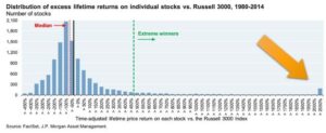 Efectivamente, si observamos el resultado interno de los índices a largo plazo, descubrimos que desde 1926 sólo el 4% de las mejores compañías que han pasado por los índices contribuyen a su rentabilidad neta total. Además, 4 de cada 7 acciones dieron una rentabilidad inferior a los T-Bills (el equivalente a las Letras del Tesoro Español). Esto quiere decir que la inmensa mayoría de las acciones no producen rentabilidad neta al pasar por el índice, pero las que sí lo producen son mucho menos frecuentes y su impacto positivo es tan grande que compensa el efecto agregado de las perdedoras: