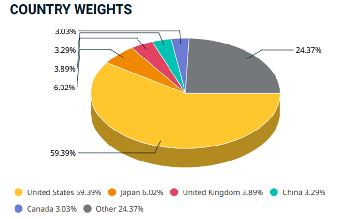Cabe preguntarse si con 75 países ahora se diluye o no el peso de los EE.UU. y la respuesta, para martirio de muchos, es que no. O no demasiado. Por ejemplo, en el MSCI World, que sólo incluye a los 23 Developed Markets, el peso de EE.UU. es de casi el 67 %. En la madre de todos los índices de MSCI, sumando 52 países más, 24 emergentes y 28 “mercados fronterizos”, el peso de EE.UU. se diluye hasta el 59 %. Una «apabullante» corrección de 7,56 puntos porcentuales. Eso es lo que consiguen 52 países más, entre los cuales está China, una economía gigantesca, la segunda del mundo por PIB y la primera por PIB p.p.a., cuyo mercado bursátil tiene el tamaño del Reino Unido.