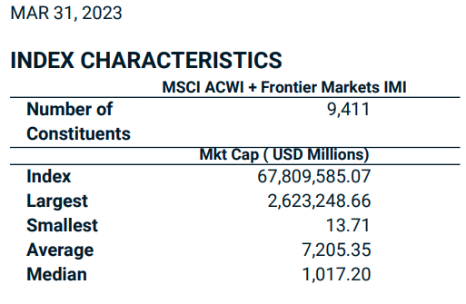 Las 10 acciones con más peso del super índice de todos los índices son todas norteamericanas y representan el 13,88 % del peso de todo el índice, donde recordemos figuran 9.411 miembros, de los cuales el más pequeño capitaliza apenas 14 millones de dólares y donde el tamaño medio es 7.205 millones, aunque el mediano tan sólo lo es de 1.017 millones. Mucha leña para tan poco fuego, dirá algún malpensado.