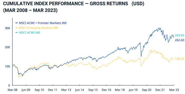 Sumar más y más países no añade gran cosa a la rentabilidad bursátil. De hecho, los 28 Frontier Markets capitalizan poco más de 106.000 millones de dólares, una empresa muy del montón en un índice como MSCI World. La diferencia de rentabilidad entre el MSCI ACWI y el mismo índice más los Frontier Markets es infinitesimal y roza el ridículo. Eso sí, has sumado 28 adornos adicionales y puedes decir que inviertes en África occidental y en cuatro lugares más cuyos mercados bursátiles sólo los conocen cuatro frikis.