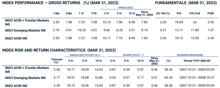 Para muchos inversores indexados lo ideal es estar indexado al mercado global de acciones, algo que resumen en el manido «compra el mundo y échate a dormir». La indexación, por ejemplo, al S&P 500 entraña desde este punto de vista riesgos evidentes tales como el riesgo-país (sólo acciones de los EE.UU.) y las incertidumbres derivadas de un posible declive económico y geopolítico del «hegemón» mundial norteamericano, acosado por China y otros paladines del «multipolarismo». Desde este punto de vista el inversor tiene razón y, por tanto, la indexación al mundo, a todo el mundo, vendría a solventar ambos problemas.
