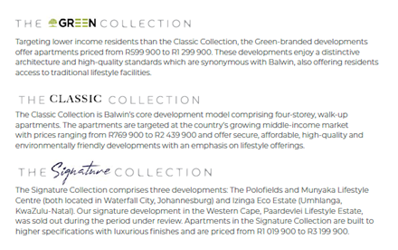 La empresa procura ser muy selectiva con las zonas de promoción y con el volumen de estas, aunque, dependiendo de la demanda y para el segmento Green, están abiertos a incrementar el tamaño de la urbanización si fuera menester. Esta selección o contención de posibles sueños de grandeza es un extra de tranquilidad a la hora de saber que el equipo directivo no está soñando en imposibles, sino que mantiene los pies en la tierra y las cuentas cuadradas. Las urbanizaciones cuentan con una gama muy amplia de servicios, incluyendo, además de la fibra, spa, restaurantes, gimnasios, campos de squash o deportes de acción, salas de juego, salas de cine, parque infantil, pistas de pádel, servicios de lavandería y otros. Además, el proyecto Blyde fue el primero en Sudáfrica —en marzo lanzaron el segundo— en contar con la piscina-lago de la empresa hispanoamericana Crystal Lagoon. Esta posibilidad es exclusiva para Balwin Properties en todo el territorio de Sudáfrica. Esto es una ventaja competitiva importante, pues les diferencia sobremanera de cualquier competidor.