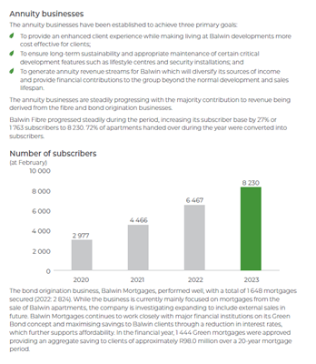 Esta imagen nos habla del negocio de generación de otras fuentes de ingresos para la empresa. En este caso, la suscripción a la fibra instalada y el segmento de «apoyo a las hipotecas» que, como se indica en la información adjunta, el año pasado realizaron un aseguramiento de 1.648 hipotecas, logrando para sus suscriptores un ahorro de 98 millones de rands sudafricanos para el periodo de hipoteca de 20 años. De esta forma, Balwin logra diversificar su fuente de ingresos y, además, realiza una labor que es valorada muy positivamente por sus clientes. Hay una pequeña fuente de ingresos extra —reducir los costes de energía a sus clientes— que ya empieza a dar beneficios a Balwin, aunque de momento sólo a una escala muy pequeña.