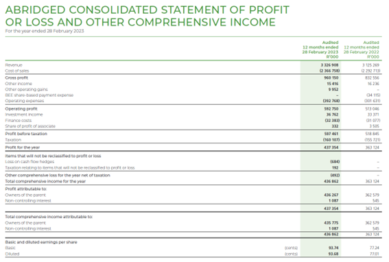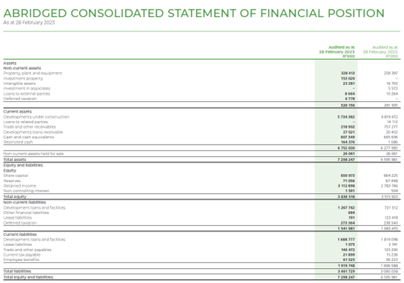 Veamos algo respecto las cifras que, por alguna curiosa razón, parece ser la parte que siempre más interesa a los lectores. Pues mirémoslas. Arriba os he adjuntado la cuenta de pérdidas y ganancias. Como vemos, el margen bruto sobre la cifra de ventas es casi un 29 %, no es exageradamente asombroso, pero tampoco estamos hablando de una empresa sin necesidad de inversión en capital. Esta sí lo es, como todas las de su sector, y no es, para nada, un mal margen. De hecho, dado que la empresa está tan bien gestionada y su resultado financiero (ingresos menos gastos financieros) es positivo, es más que suficiente para generar un beneficio después de impuestos superior al 13 % sobre ventas. Para los que sean más aficionados al dato del PER, si calculáis el PER de esta empresa —que gana un 13 % sobre ventas— veréis que los 250 centavos de rand de cotización, divididos por los 93,68 centavos de rand de beneficio diluido por acción nos deja un PER de 2,67 veces. No sé si alguien tendrá claro qué es un PER barato, pero, en mi humilde opinión (y sin que esto signifique que el PER nos dice toda la verdad relativa a lo barato o caro de una acción), Balwin Properties parece una empresa barata. Muy barata.