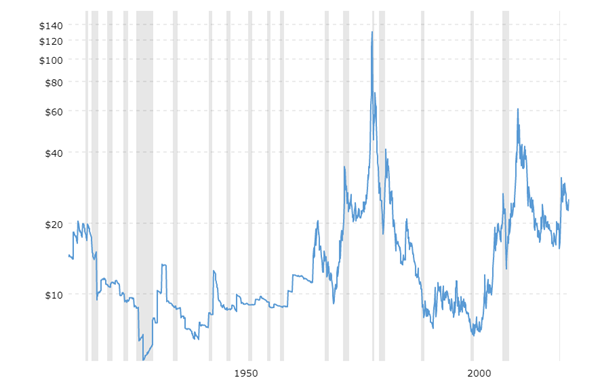 Precio histórico de una onza de plata en dólares, ajustado a la inflación (fuente).