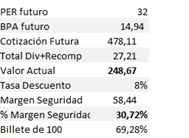 En la imagen podemos ver, en un lado, la situación de la compañía en el momento de la compra. En teoría, cotizaba muy cara, con un PER de más de cuarenta veces. En el otro lado, vemos las estimaciones de valor. Desde luego, yo no podía asumir que siguiera cotizando a un PER tan elevado pero, dado el tipo de empresa que es, tampoco me parecía lógico asumir un PER promedio de toda la bolsa. El beneficio por acción (BPA) futuro salía de estimar que la compañía mantuviera el crecimiento anual medio de largo plazo que venía mostrando. Para una empresa como Ferrari, que tiene el poder sobre el consumidor, me parece una asunción bastante razonable. El dividendo presupone una ratio de reparto algo inferior a la que había mostrado en el pasado y la tasa de descuento era ese 8 %, una tasa que pudiera considerarse algo baja, es decir, optimista. Sin embargo, en el momento del análisis los tipos de interés estaban al 0 % y la empresa no merece estimarse como de alto riesgo. No tiene deuda, sus márgenes son excelentes, sus productos, más que demandados, son amados… En fin, creí que el 8 % era justo. Ello nos daba un valor actual de casi 250 € por acción, con un margen de seguridad sobre nuestro precio de compra del 30 %, el más escaso que he aceptado nunca, si no me falla la memoria.