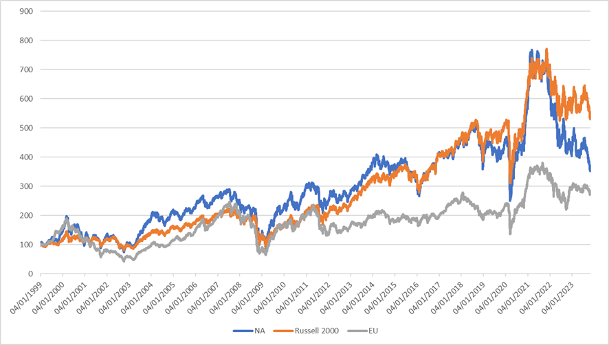 En este caso vamos a analizar brevemente las small caps en EE.UU. (y Canadá) y en Europa.