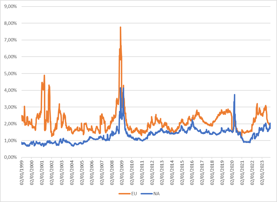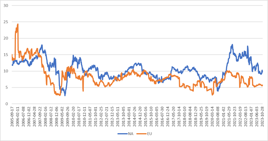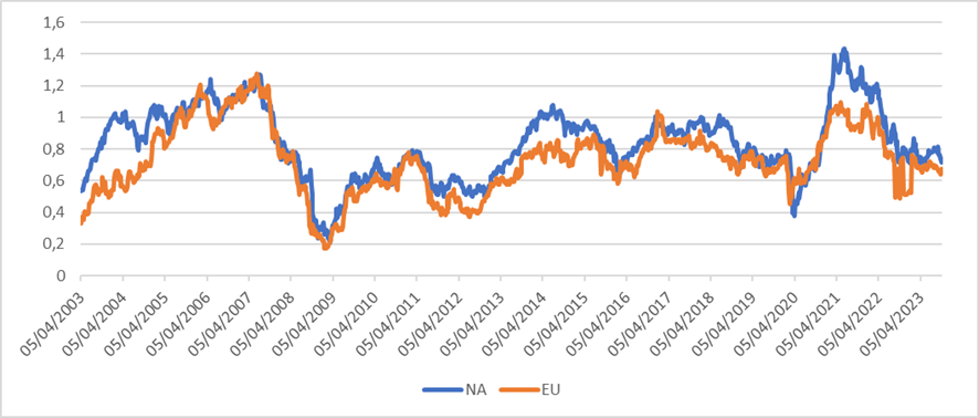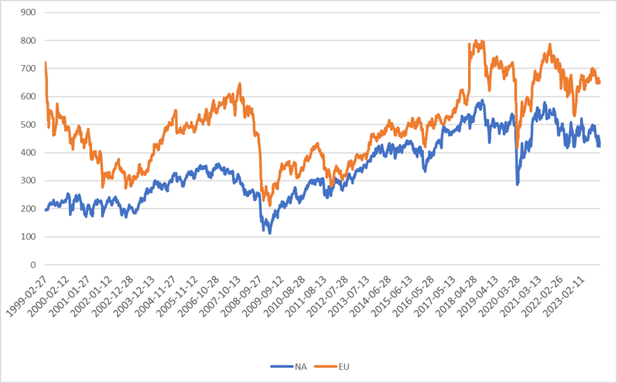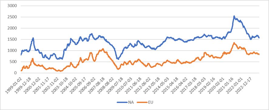 Hay, de media, 3 veces más empresas en Norteamérica que en Europa. OK, parece razonable. A nivel tamaño de mercado y a nivel seguimiento de proveedores de datos. No se mira ni tanto ni en el mismo detalle el mercado americano que el europeo. Si añadimos que el proveedor de datos (FactSet) es americano…