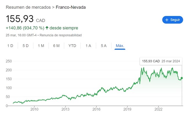 Estas empresas de royalties han demostrado ser excelentes inversiones en el mercado bursátil, con nombres destacados como Franco Nevada, Royal Gold o Wheaton, que han generado un impresionante compounding. De hecho, FNV ha multiplicado por diez veces desde la IPO en 2007. ¿Por qué son tan atractivos estos negocios? Principalmente, debido a su estructura ligera de activos en comparación con las mineras tradicionales. Solo requieren una oficina y un equipo de unas 20 personas para su funcionamiento. De hecho, Franco Nevada presenta ingresos por empleado de 27 millones, algo que casi ninguna empresa en el mundo logra (gigantes tecnológicos como Meta tienen sobre 2 millones). Además, ofrecen una exposición apalancada al precio de los metales, como el oro, lo que las hace beneficiarse de las tendencias inflacionarias. Sin embargo, a diferencia de las mineras, no enfrentan riesgos operativos ni de capital. Incluso en caso de sobrecostes, el titular de la regalía sigue recibiendo los mismos pagos, independientemente del precio al que se extraiga el metal.